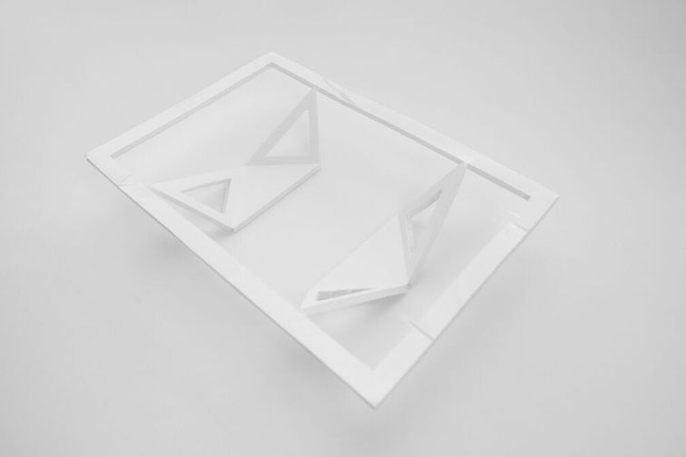 “Serene” is a conceptual table imagined for south-facing living spaces. Its triangular stands are placed to cast slow-moving shadows across the floor as daylight shifts, turning time itself into a quiet design feature. The intended materials - warm white oak and inlaid glass - create a soft but grounded presence.